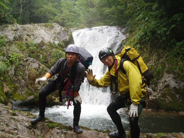 し、最後の12m直瀑に行く手をふさがれる。流水の右側を高田さんが何度かトライし