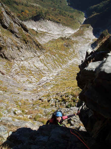 凹状岩壁取り付きにて。ここで高橋さん・寺本さんはここから出発。
