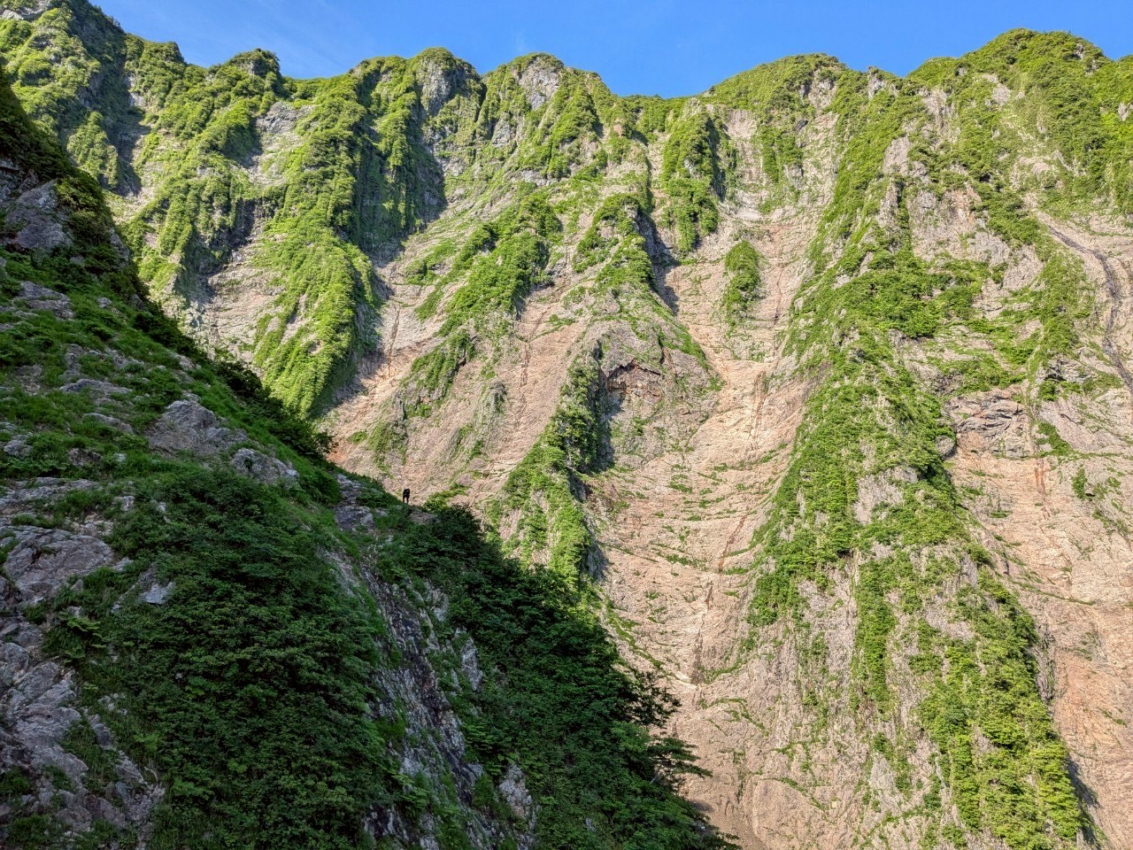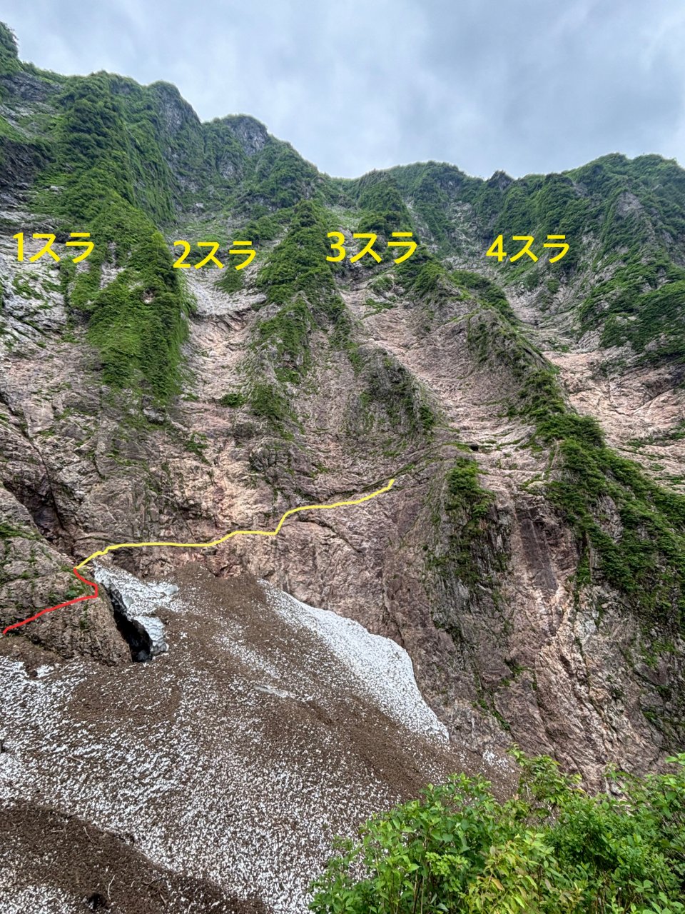 かつては鉱山道が3スラまで伸びていたそうで、うっすらとバンドが残っていますが、雪崩で削られてしまったようです。