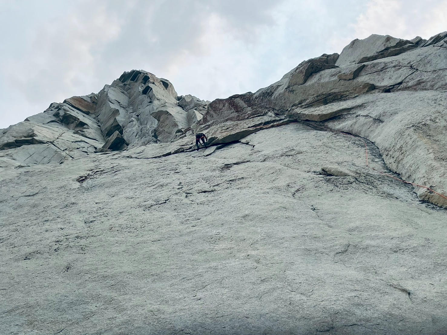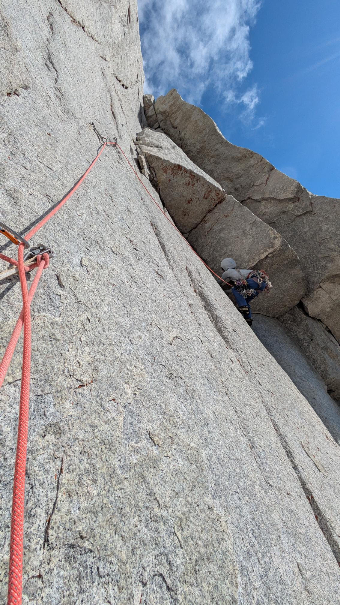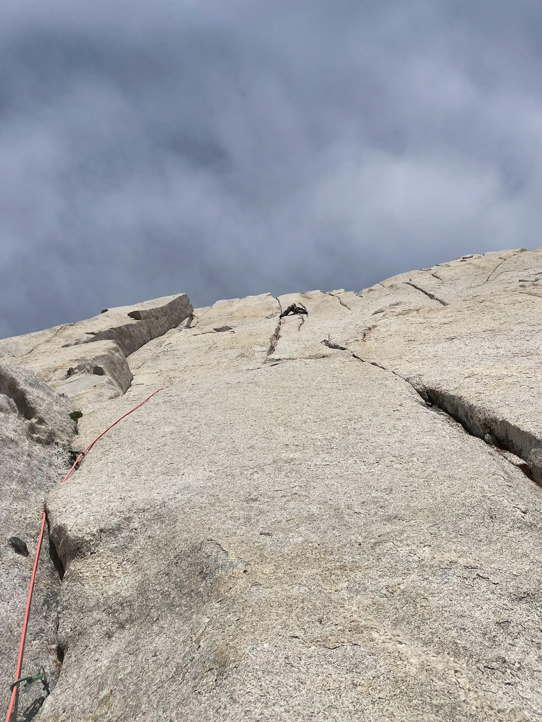 最終ピッチは40m 11dのクラック。序盤のテラス以降からカムの座りが良くなく、中間部ダブルクラックはどちらも割れ目が閉じ気味でプロテクションが取りにくく、疲れた身体にはかなりきついピッチ。後半には腕が攣りはじめたけど、岩をよく読んでOS。終了点から稜線上のボルダーまで上がり完登とする。