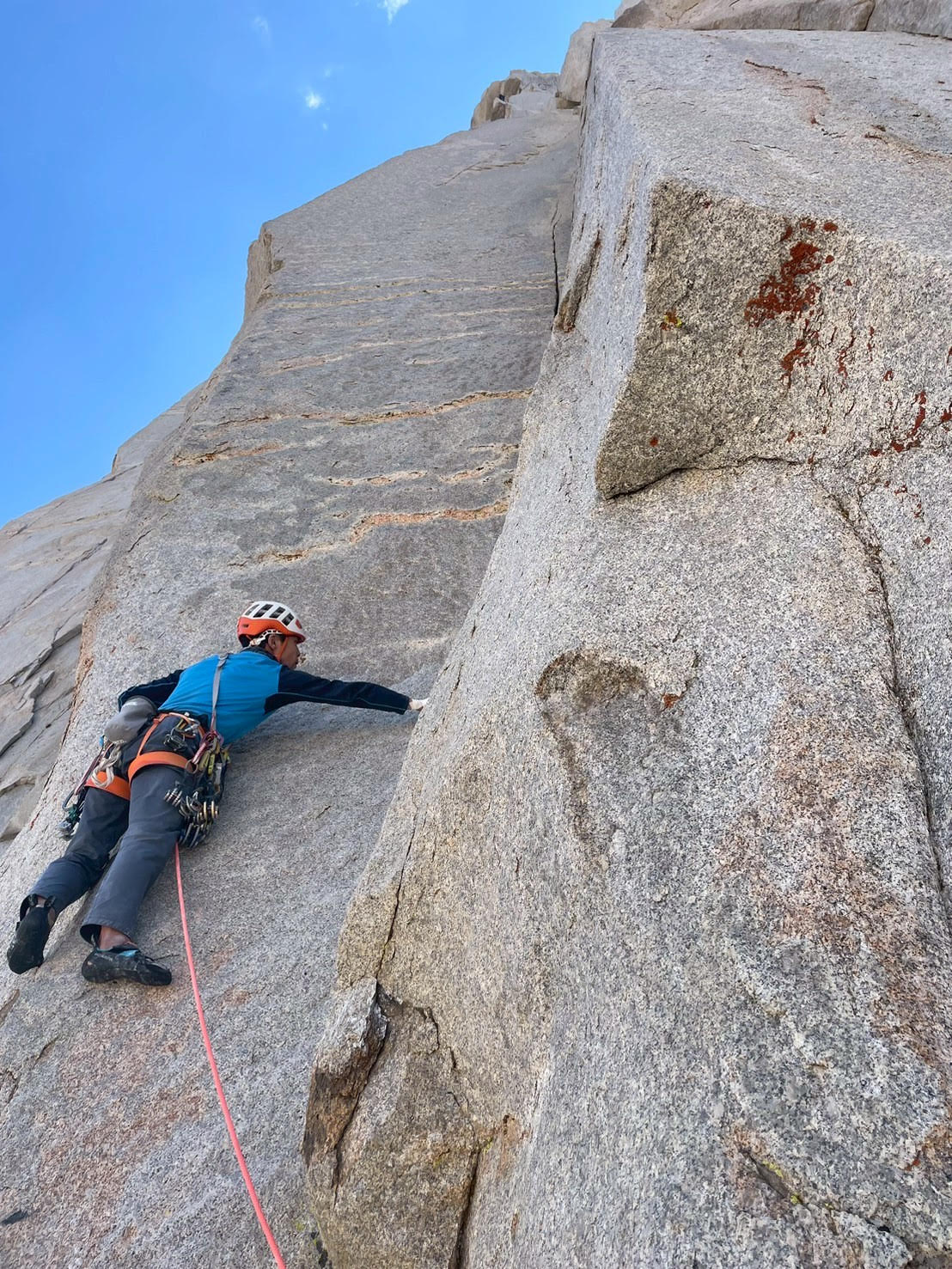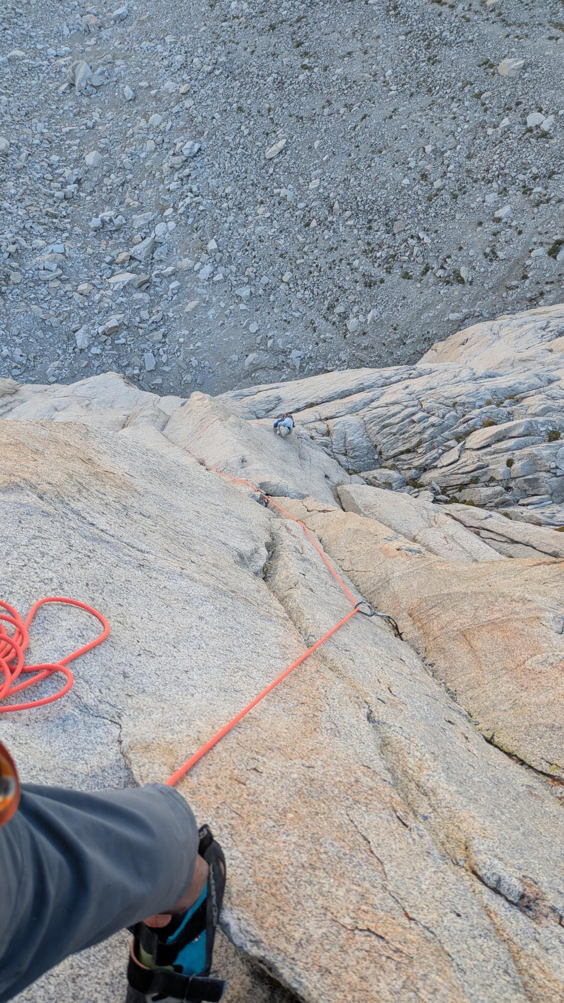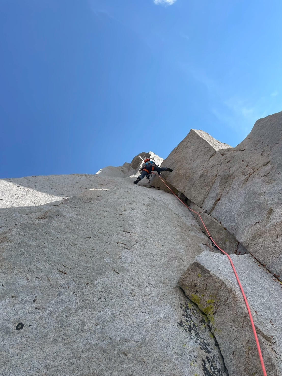 最終ピッチは40m 11dのクラック。序盤のテラス以降からカムの座りが良くなく、中間部ダブルクラックはどちらも割れ目が閉じ気味でプロテクションが取りにくく、疲れた身体にはかなりきついピッチ。後半には腕が攣りはじめたけど、岩をよく読んでOS。終了点から稜線上のボルダーまで上がり完登とする。