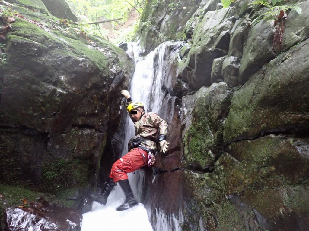核心部は一カ所、ナイアガラの滝の手前のゴルジュのみ。泳ぎ、ハンマー投げ、へつりと色々試しましたが水流強く断念。高巻きました。高巻きもロープがあるものの、悪そうだったのでビレイ。ナイアガラの滝を越えたあたりの支流を使って林道に上がり脱渓しました。