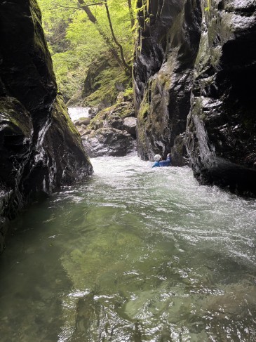 曲がりの滝は水量多いもののロープを出して直登チャレンジ!治田さんに頂いたエイリアンがバチ決まりでした。その後も簡単に巻くことができるような滝をフリーで積極的に登り、なんだかんだ充実。プチゴルジュのチムニーをバックアンドフットでずり上がるのがハイライトでした。