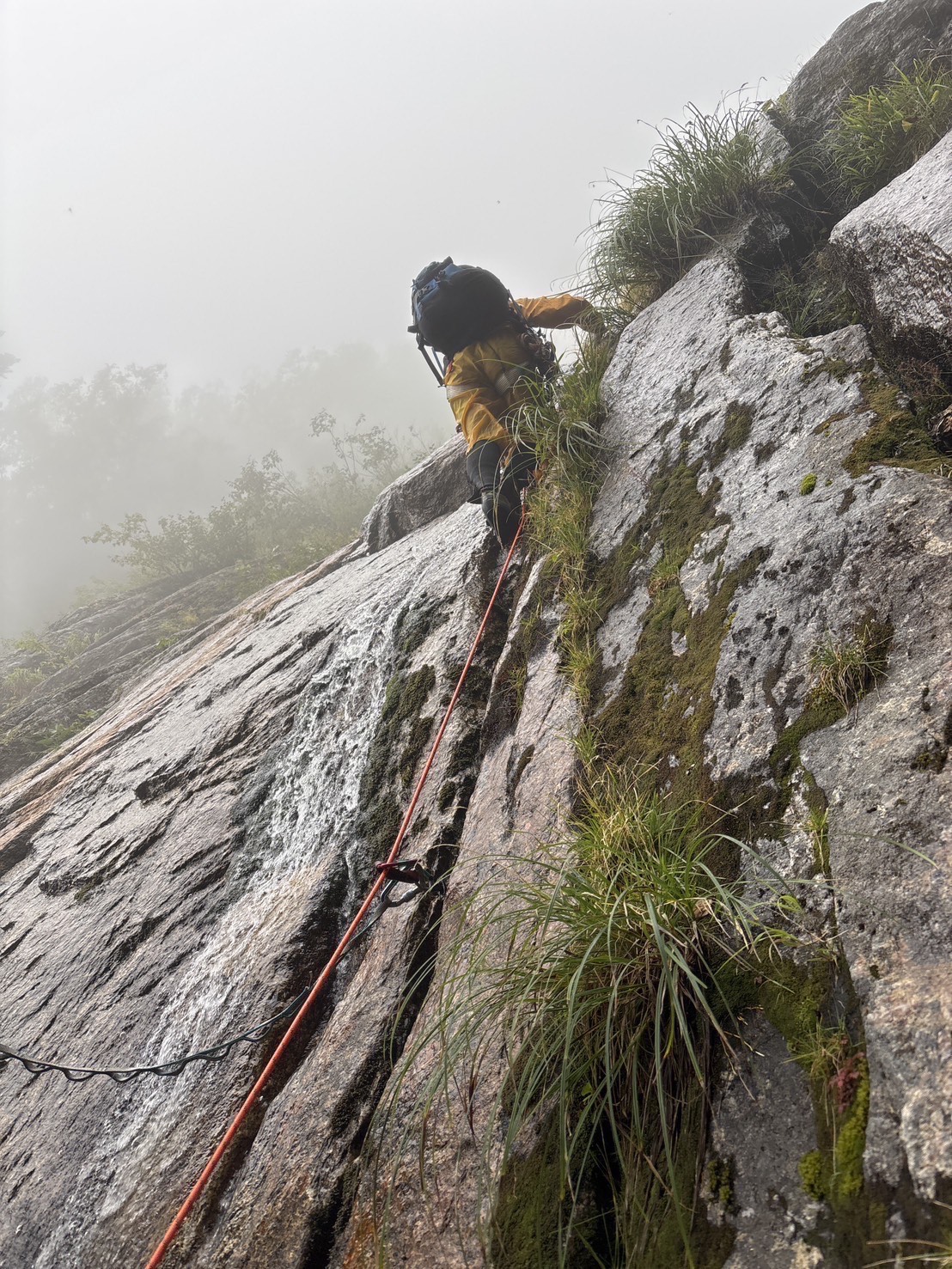 滝の裏を潜って右側に出て横のもろいルンゼを鈴木がリード。続くバンドからスラブを重富さんがリードで完登。