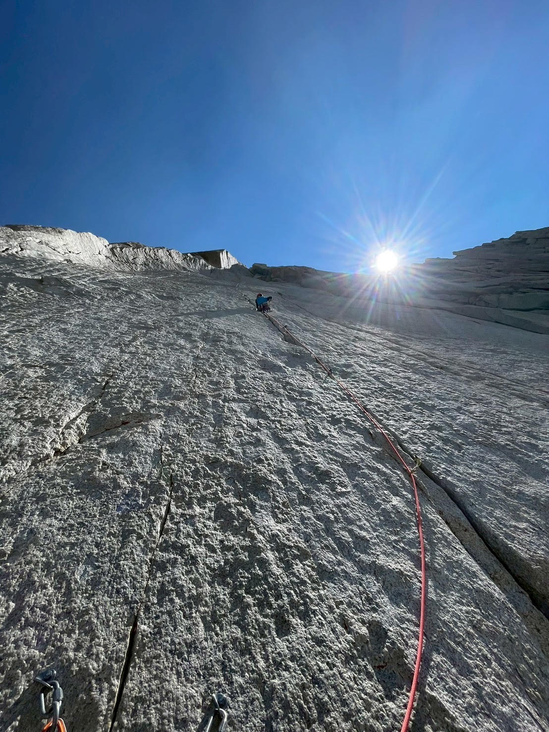 最初のピッチはまだ濡れており、エイドで抜ける。一昨日登れて良かった。次の10aを越え、右側の11dを登る。カムが効かないフレアセクションがあり、緊張感があった。4ピッチ目、核心のBook of Secrets。その名の通り本を開いたような凹角。序盤はダイクが水平に何本か走っており登りやすいが、後半になるにつれ散らばった結晶を拾うようになり、それがどんどん少なくなってくる。凹角が茶色いこともあり、文字が消えかかった古文書を読み解くよう。ステミング、レイバックでジリジリと高度を上げる、おそらく3カ所ある核心の最後の結晶1つを見逃し、足が滑ってフォール。あと3ムーブだった。