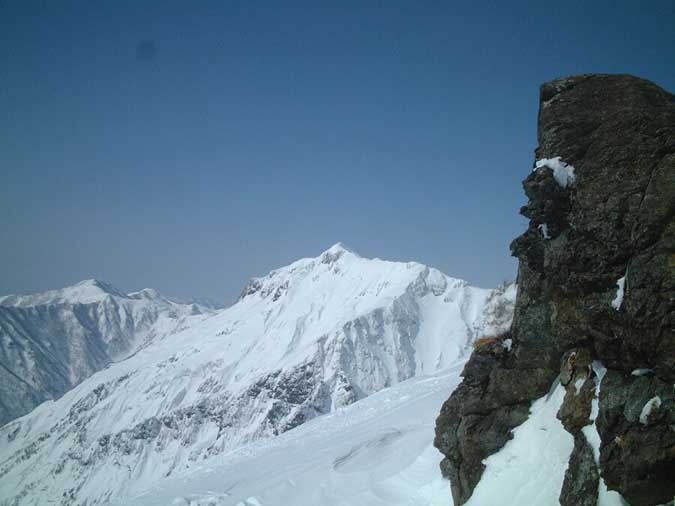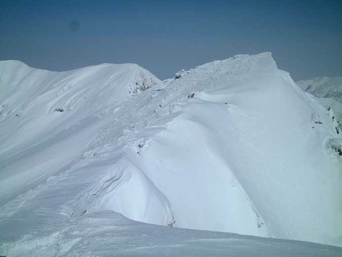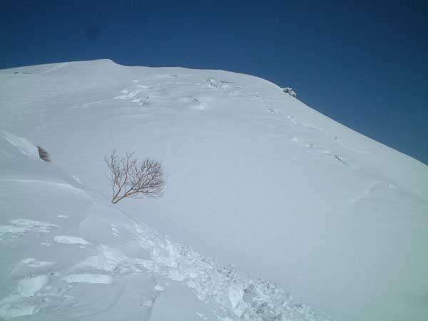 頂上で休んでいると1人稜線からマチガ沢へ滑り込んでいった。