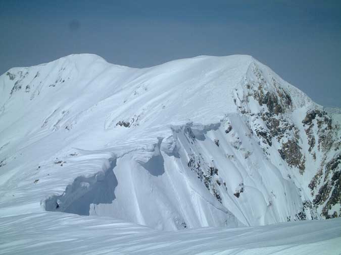 ノド上部手前で斜度がゆるむとカールの底。振り返れば稜線はかなり上だ。